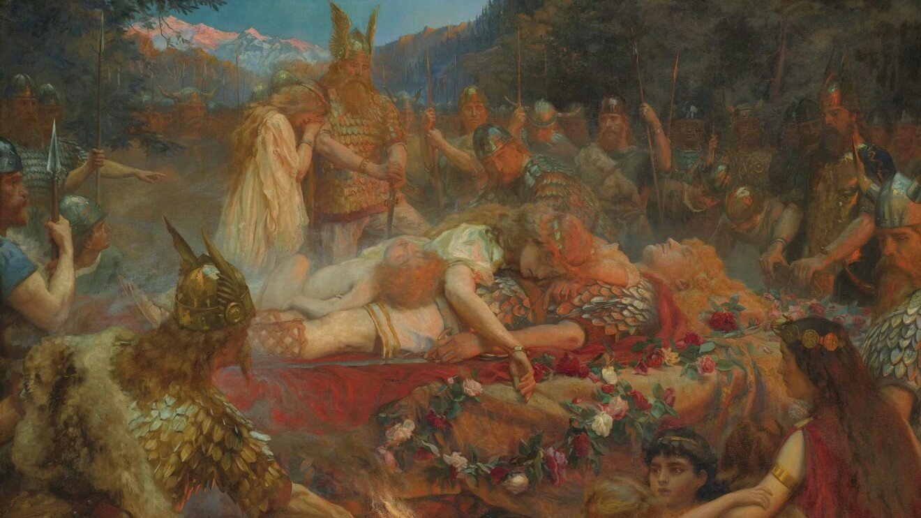 Согласно «Младшей Эдде» Снорри Стурлусона, Один постановил: «всех умерших надо сжигать на костре вместе с их имуществом». Считалось, что «чем выше дым от погребального костра подымается в воздух, тем выше в небе будет тот, кто сжигается, и он будет тем богаче там, чем больше добра сгорит с ним».